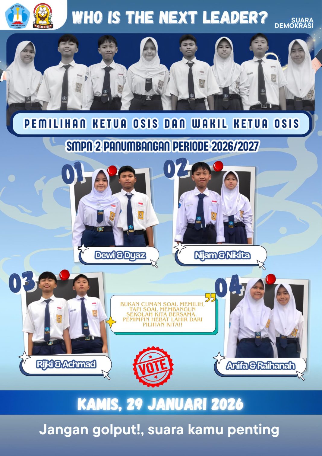 Melalui pelaksanaan pemilu OSIS, peserta didik diajak memahami dan mempraktikkan nilai-nilai demokrasi secara nyata di lingkungan sekolah, sehingga diharapkan mampu menjadi generasi yang aktif, kritis, dan bertanggung jawab dalam kehidupan bermasyarakat. (Hs)